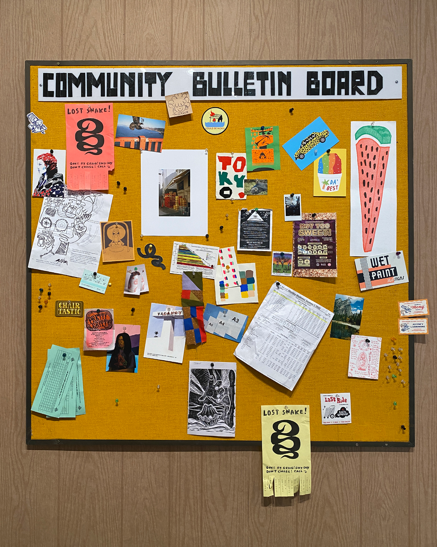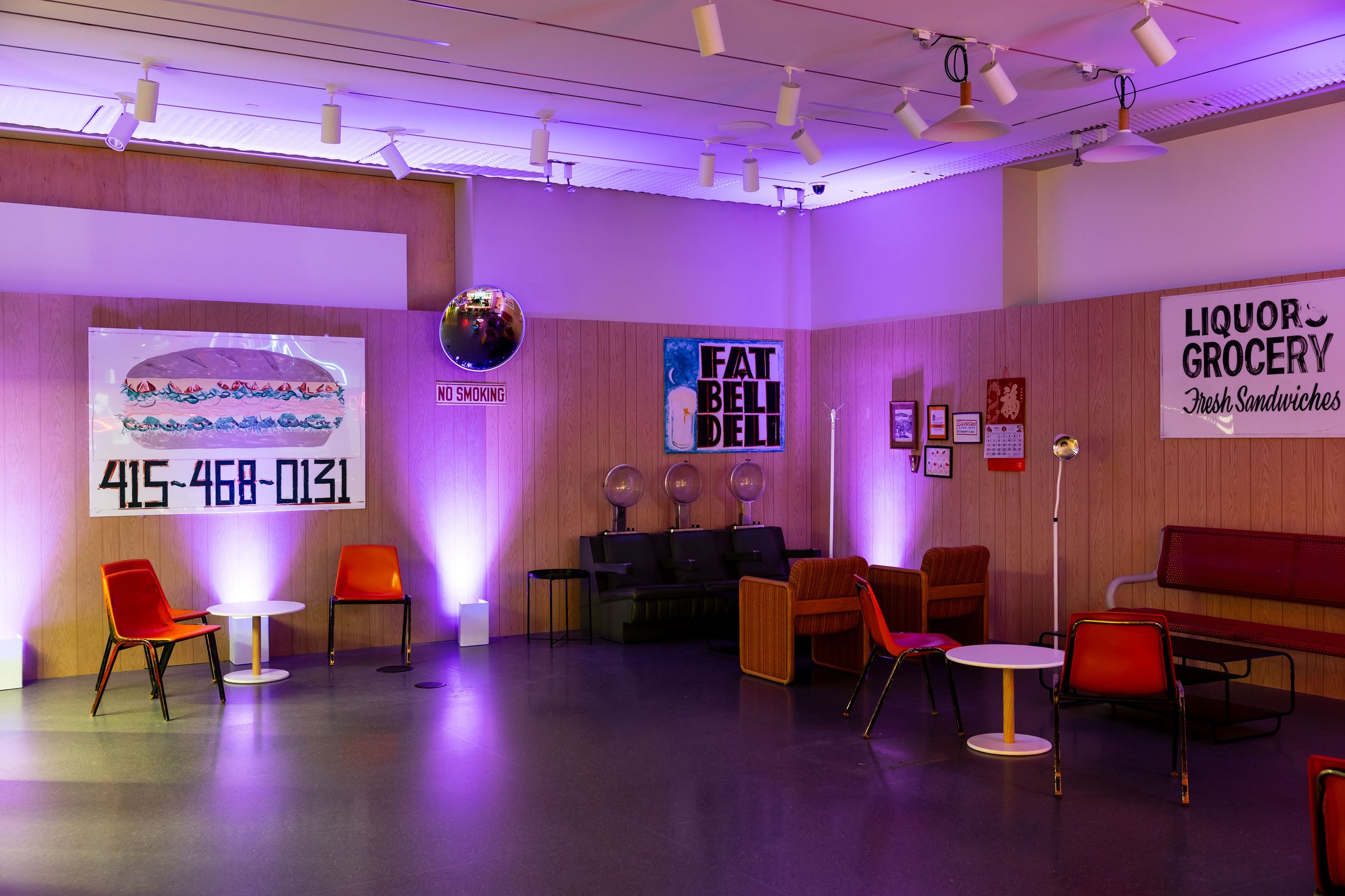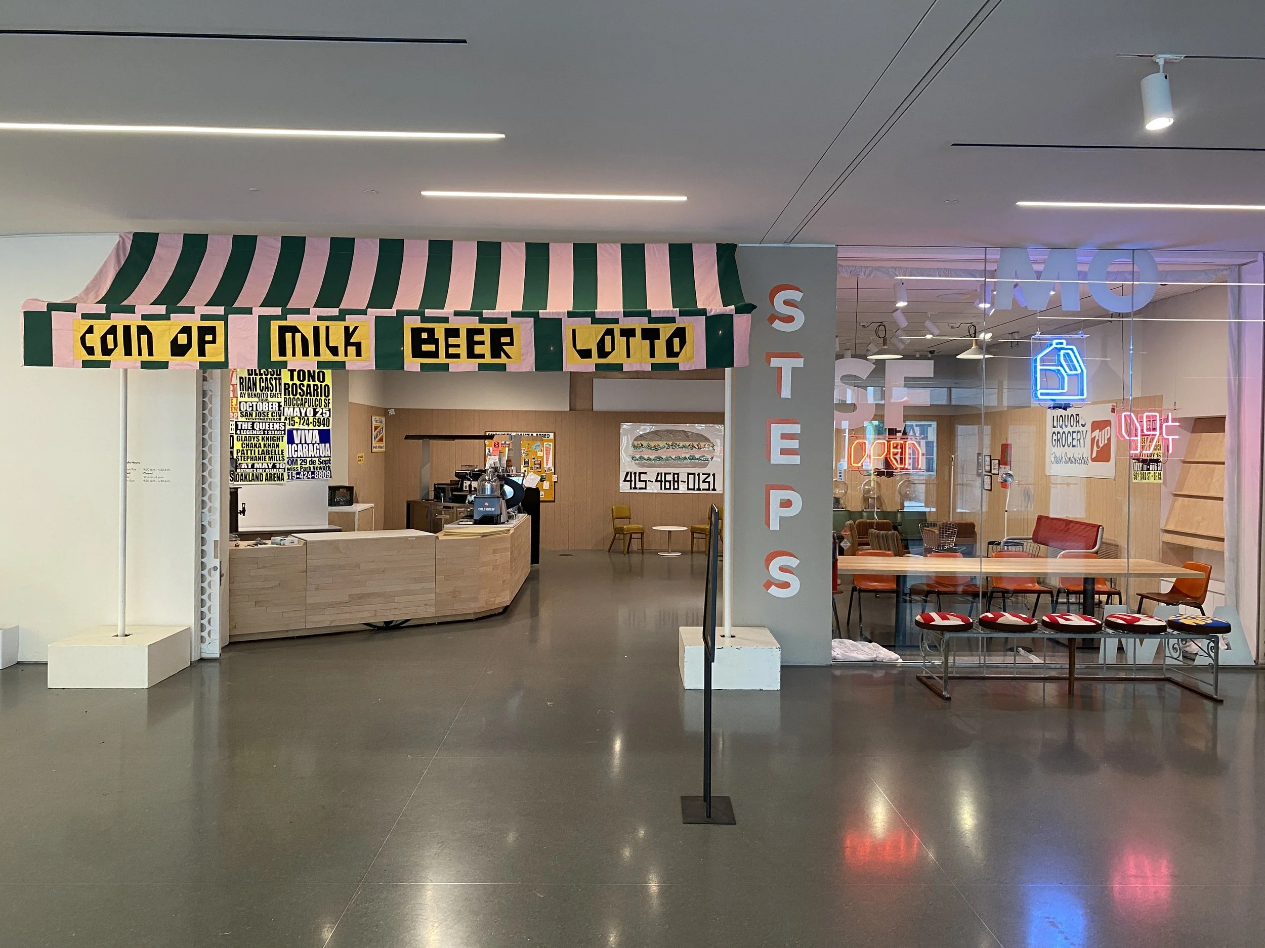 I had the opportunity to design and make a site specific installation for SFMOMA’s annual Art Bash event. I created a cornerstore/laundromat/salon inspired coffee shop in the museum. I created a sewn awning, hung up my vintage sign collection, showcased friends’ artwork and had It’s-It affogatos served. this was a celebration of what makes San Francisco a unique and special place for all, not just the elite.